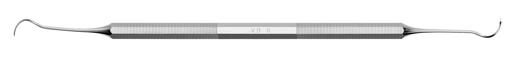 Entalhador interproximal. Instrumento muito fino, permitindo um trabalho delicado. Se for usado como desincrustador, deve ser usado com muita delicadeza.