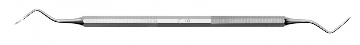 Cureta universal de ângulo muito aberto e ponta cônica para facilitar o acesso às furcas ligeiramente abertas.