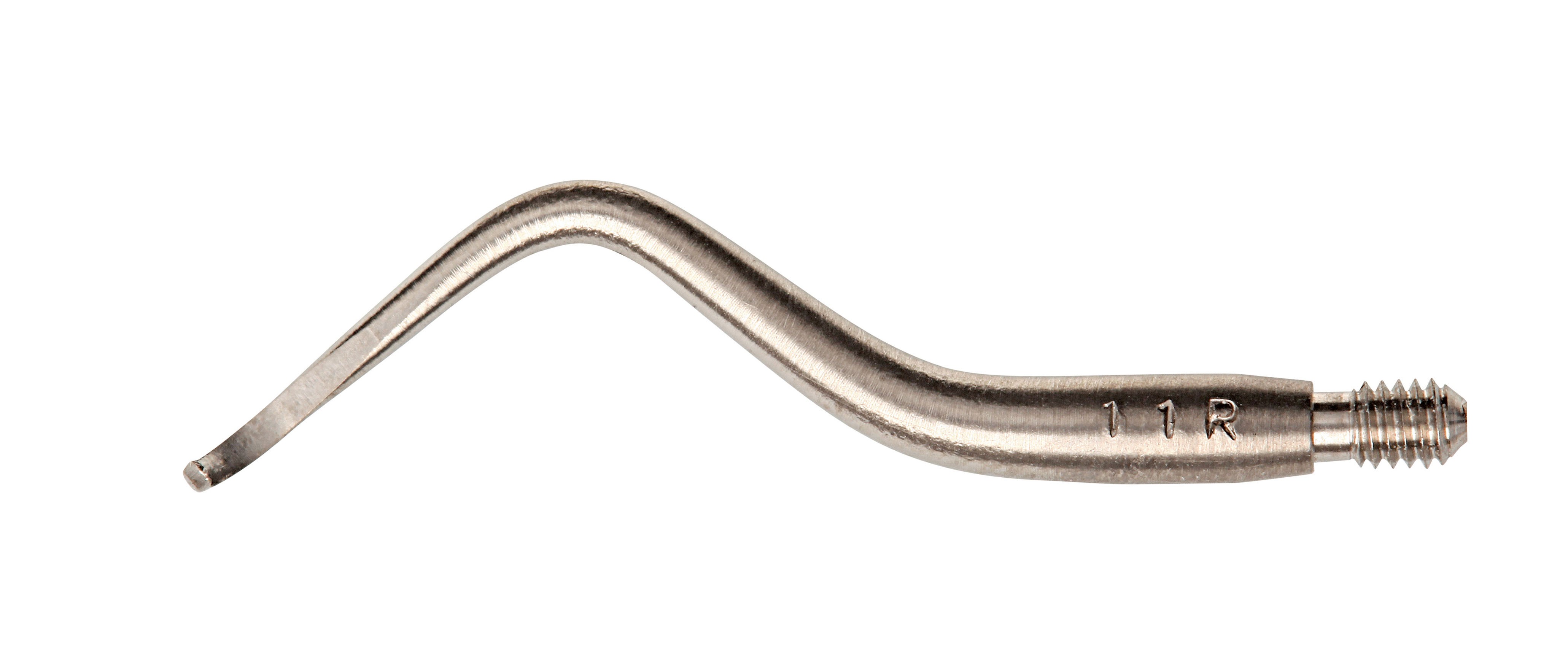 Cureta universal em titânio puro, 1 grau mais macio que o implante, para o tratamento de peri-implantite, em superfícies interproximais.